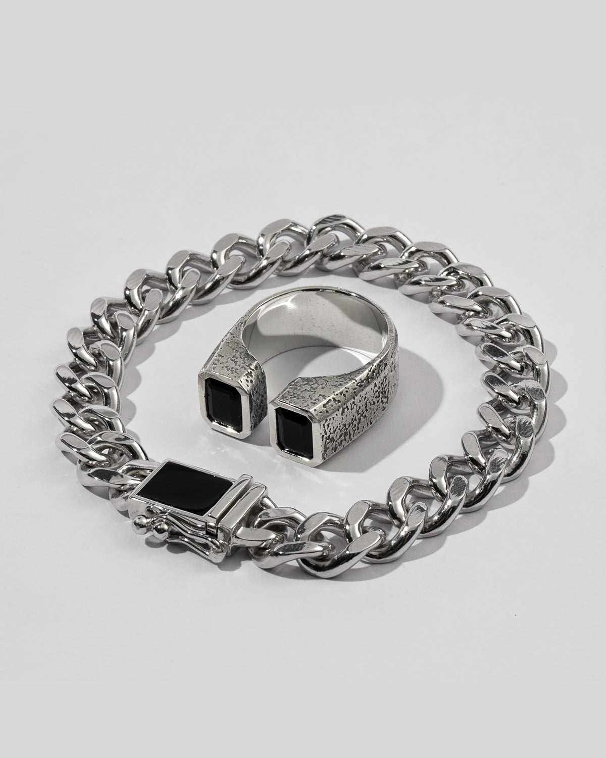 Raw textures. Black stones. Heavy links. Sharp edges.