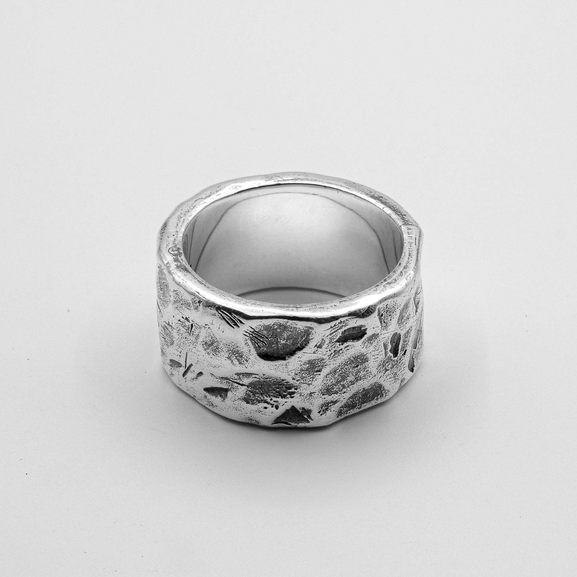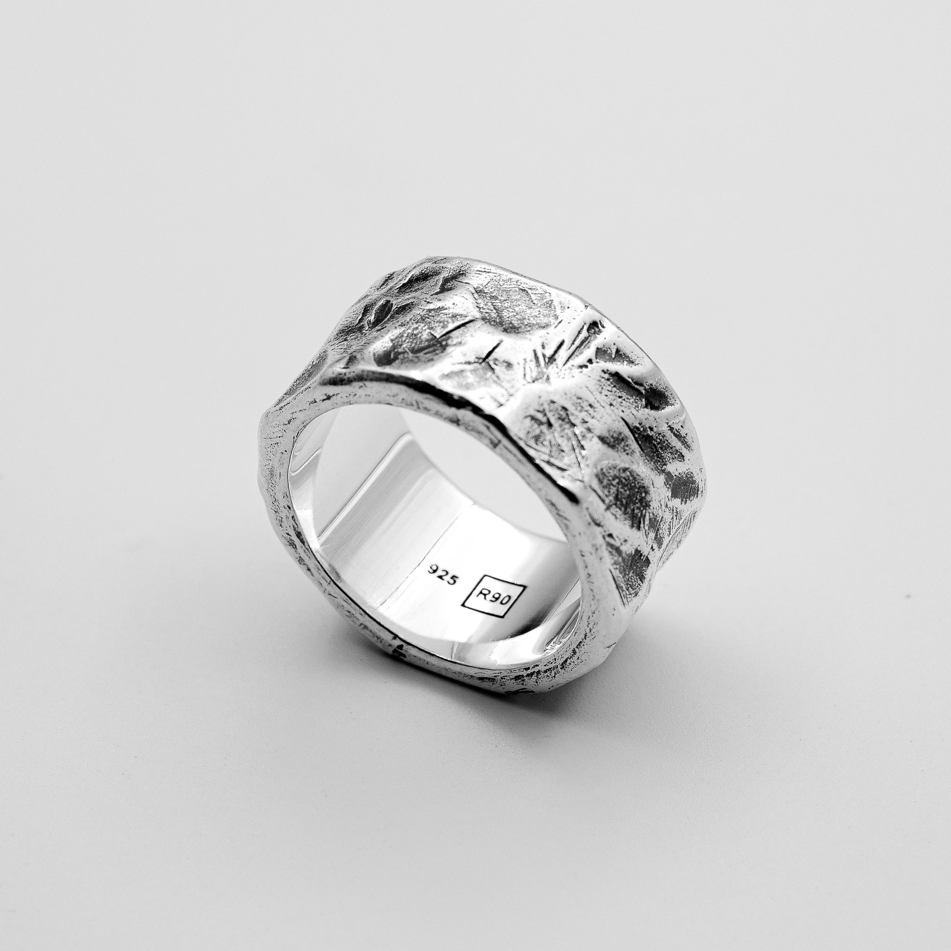 A cuff-style ring with fossilised indentations signature to the Rawninety aesthetic. Hand etched on 925 sterling silver; the intentionally heavy proportions of the Hugo Ring make it the ideal feature piece in any hand stack. Pair with the varying widths of Cruz or Mickey to complete your look.