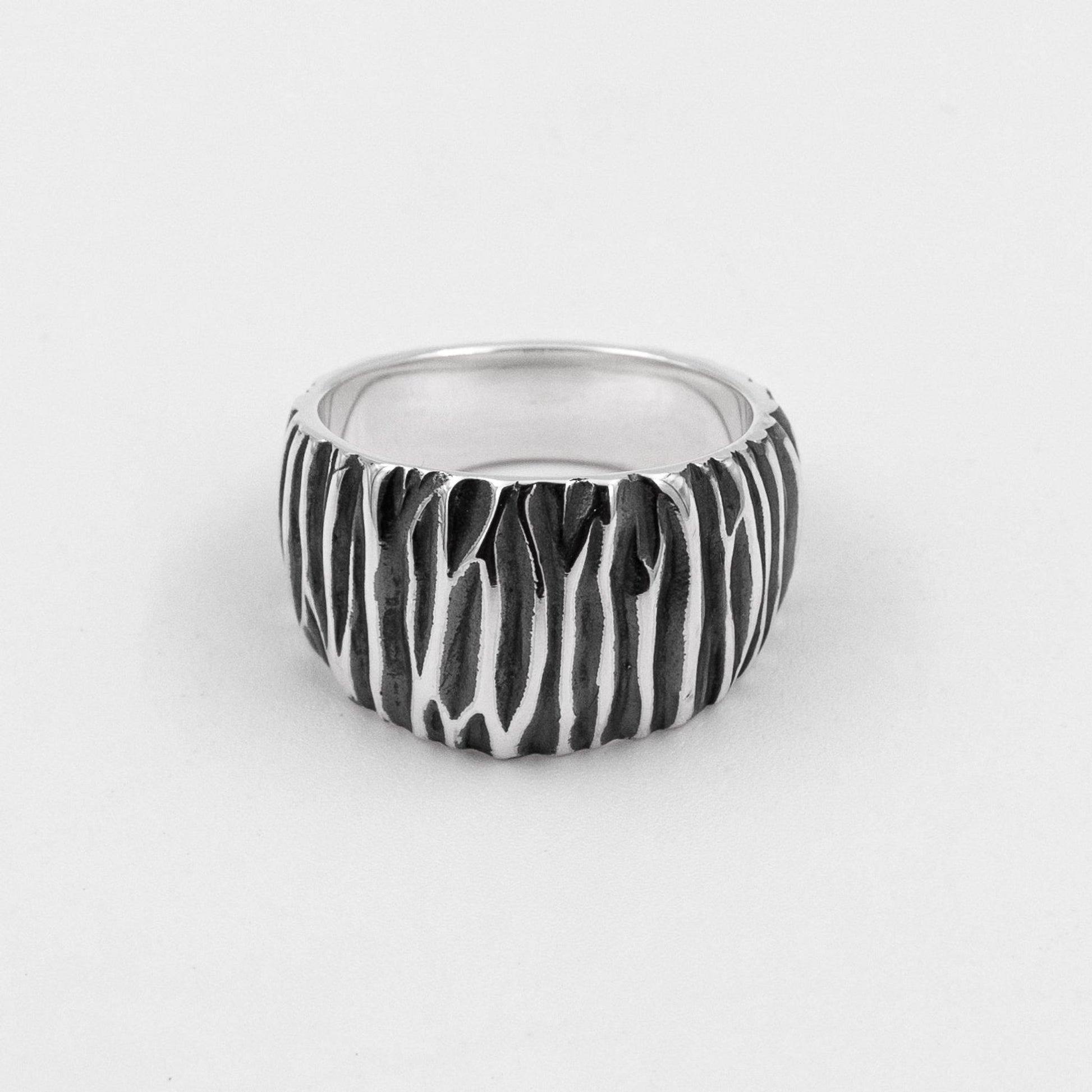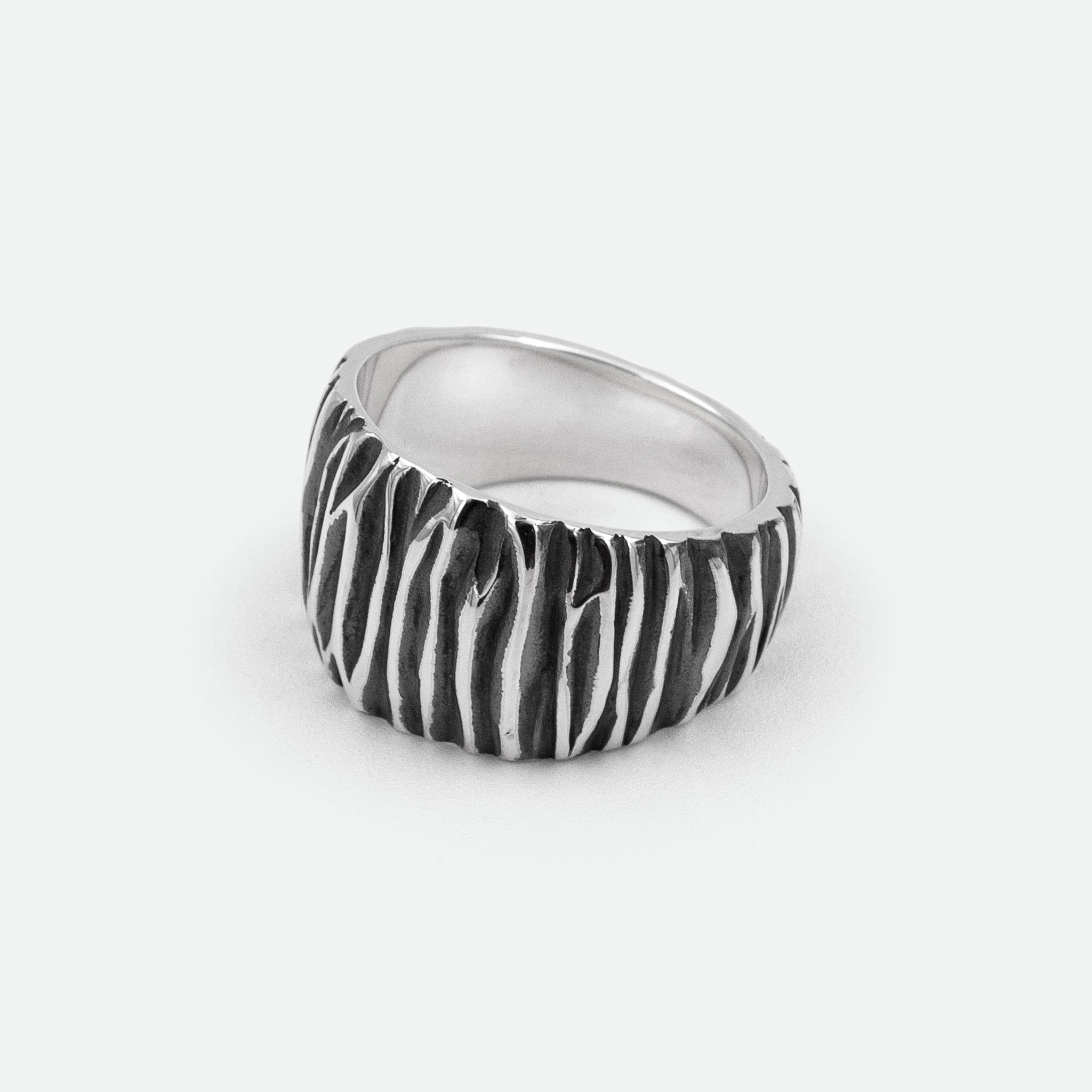 With signature oxidisation and polished edging, the Otis Ring has the visual appeal of a wide set band with a refined, smaller finish under the finger for comfortable all day wear. This unique design allows for wear on its own with the Otis Cuff, or with contrasting R90 band widths for a stacked effect.