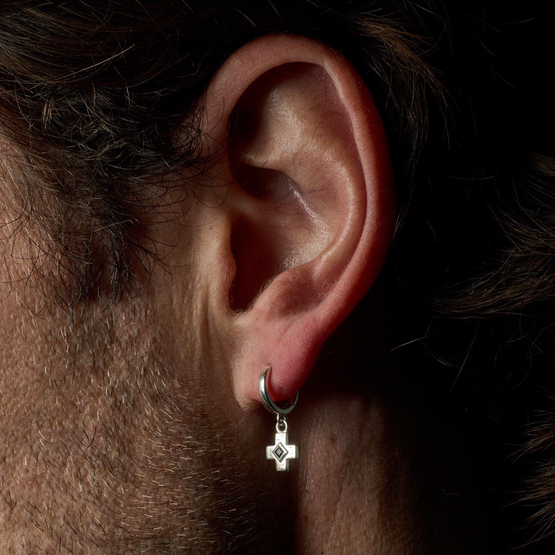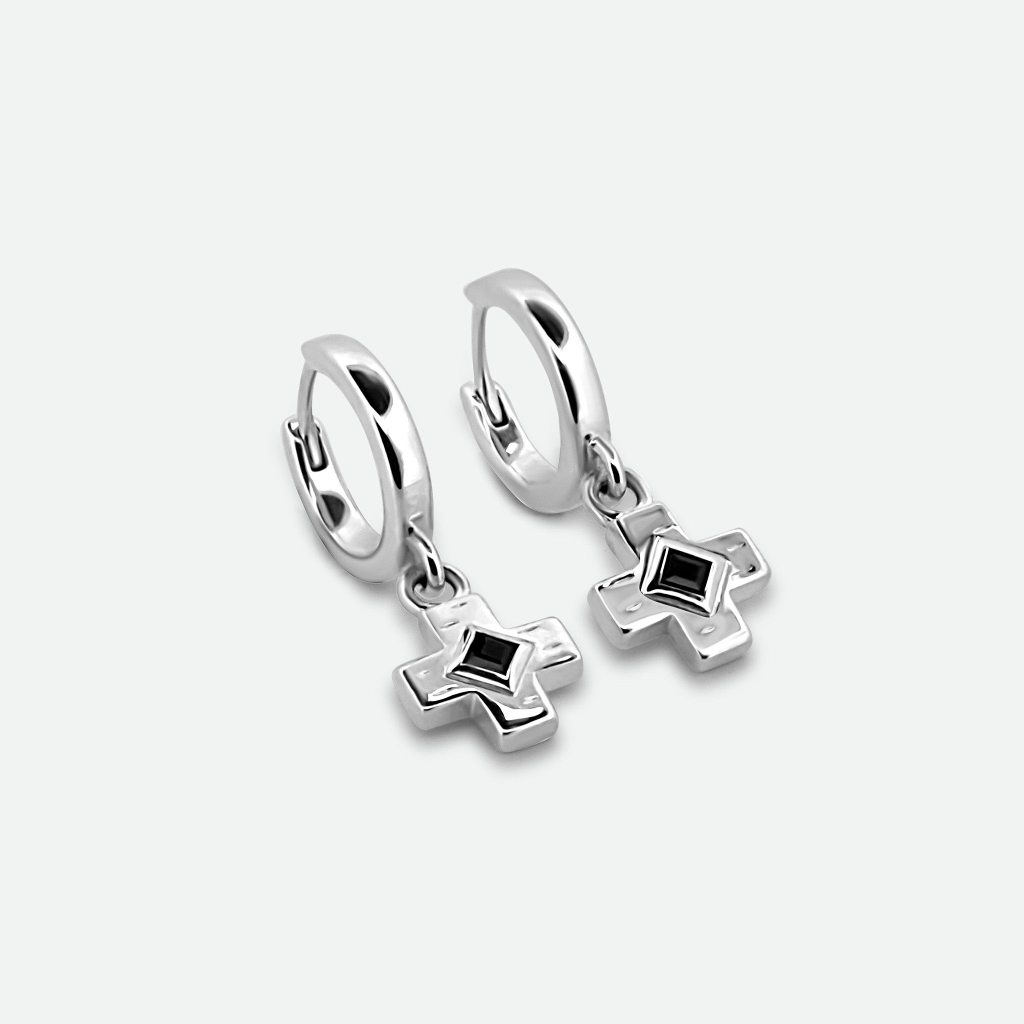 The Raven Cross Earrings mirror the design language of the Raven Ring, defined by balanced form, subtle texture, and refined detail. Handcrafted from solid recycled 925 sterling silver, each earring features a cross-shaped drop with a diamond-cut black cubic zirconia set at the centre.