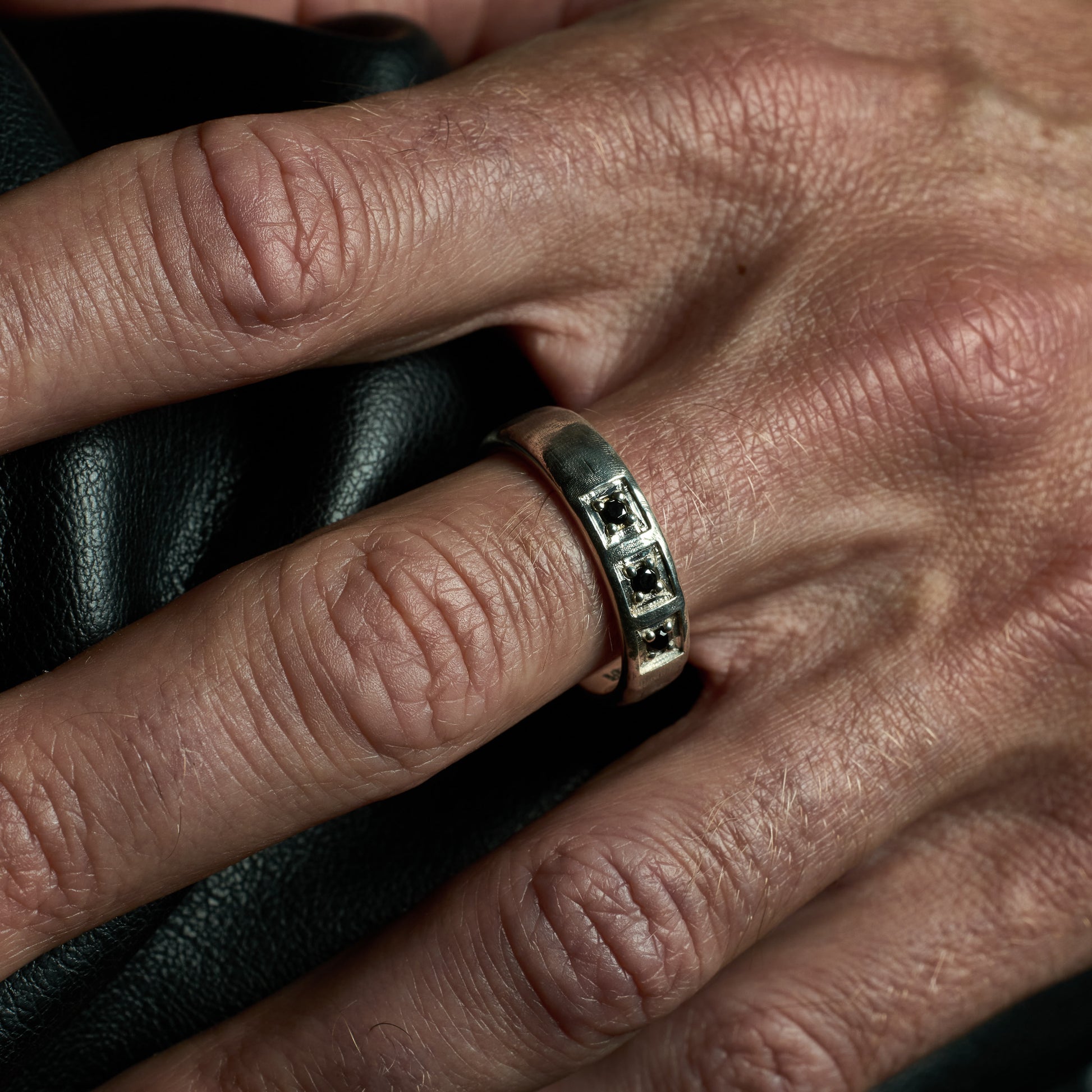 The Trilogy Ring features three bezel-set Black Diamond Cubic Zirconias arranged across a structured, hand-textured band, crafted from recycled 925 sterling silver. Each stone sits within a defined square setting, creating a balanced profile that contrasts refined detail with raw surface character. Subtle oxidisation enhances the outer texture.