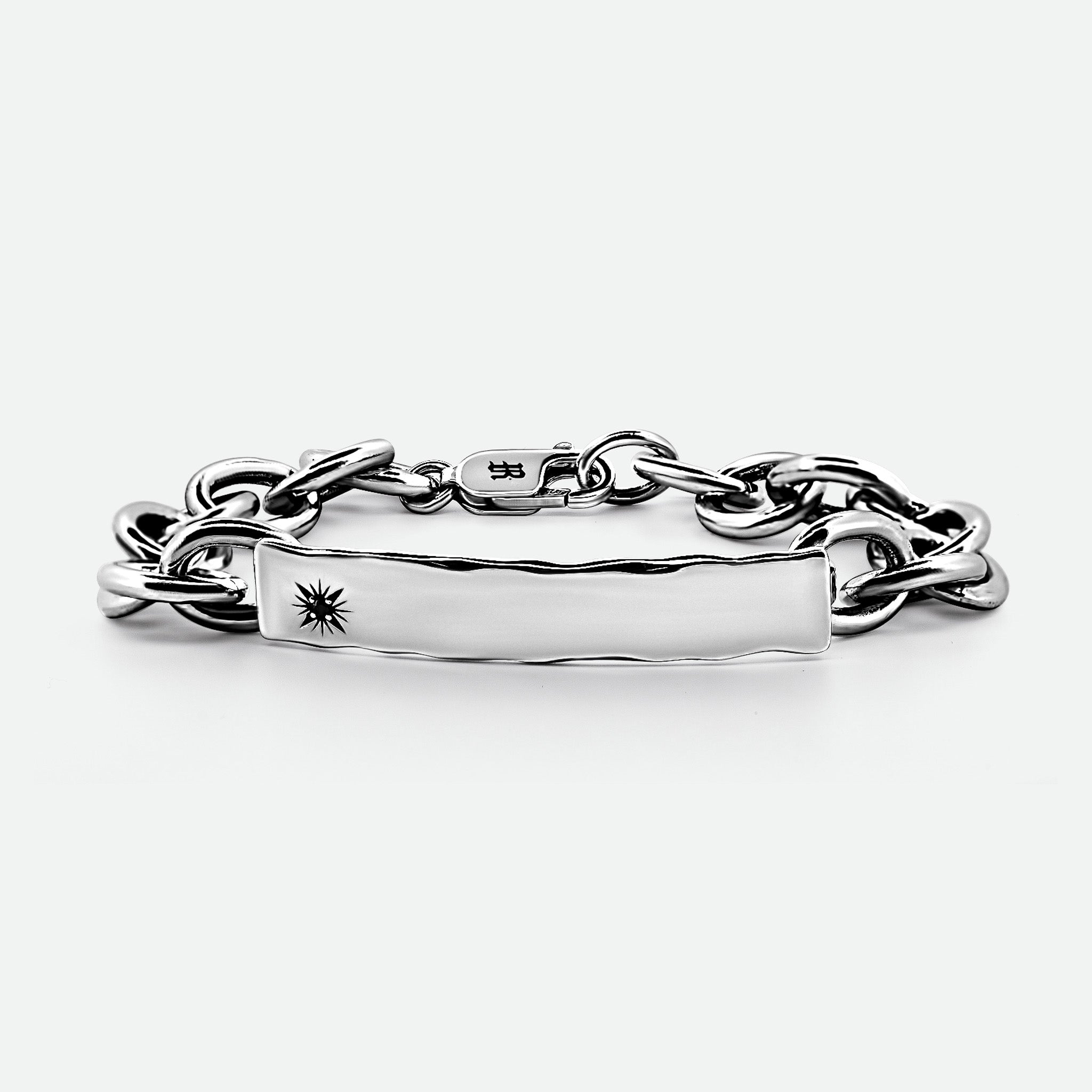 At its centre, a hand-sketched star engraving holds a black diamond cubic zirconia, symbolising strength and individuality. The Vergil Bracelet Chain is available in three core sizes – Medium (19.5 cm), and large (21.5 cm).